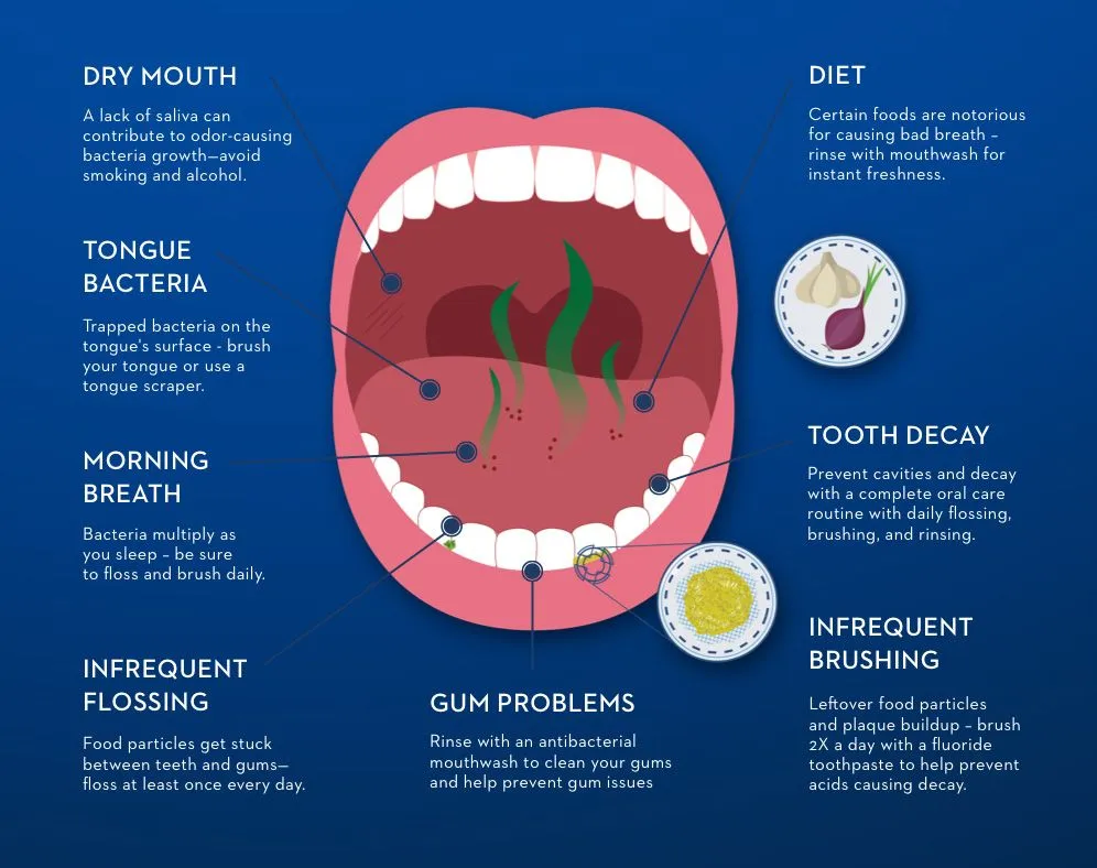 Respiratory Infections: Infections in the throat, nose, or lungs, such as sinus infections, postnasal drip, or chronic bronchitis, can cause bad breath. Additionally, tonsil stones, accumulating bacteria, may contribute to this issue.